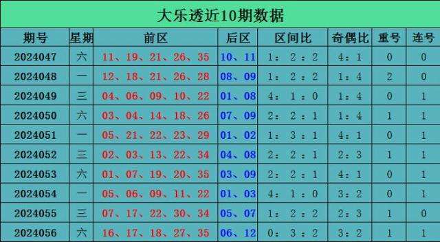 上期前区三区比为0:3:2,第2、3区表现活跃,最近10期前区三区比为18:20:12,第1、2区出号较热。