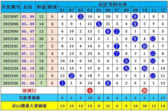 后区分析:上期后区开出号码01、06,为小小、奇偶组合。