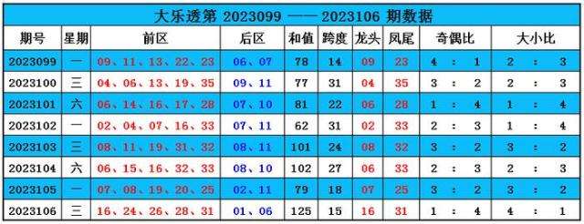 大乐透第2023106期奖号为:前区16 24 26 28 31,后区01 06。前区号码和值125,跨度为15。后区号码和值为7,跨度5。