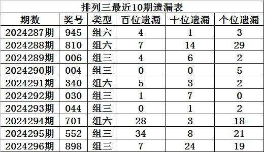 上期回顾:排列三第2024296期奖号:898,组三,直选遗漏总值为50期。