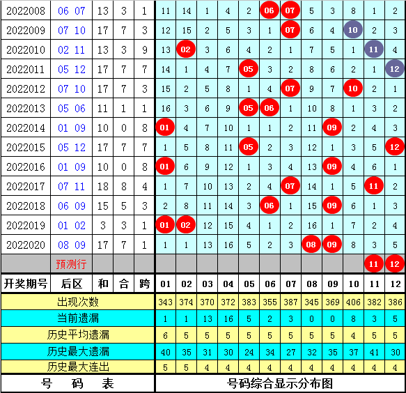 后区分析:上期后区奖号为08和09,最近十期后区开出10个热码、8个温码和2个冷码,本期预计奖号关注热码+温码组合,参考两码11、12。