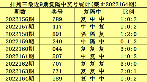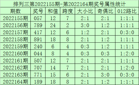 上期回顾:排列三第2022164期开奖号:189,奖号和值:18,奇偶比1:2,大小比2:1。