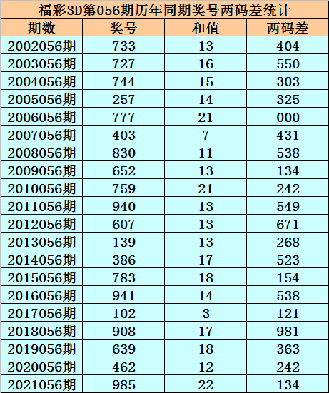 福彩3D第056期,历史上期开出20次奖号,其奖号分别为:733、727、744、257、777、403、830、652、759、940、607、139、386、783、941、102、908、639、462、985,奖号两码合差分别开出: