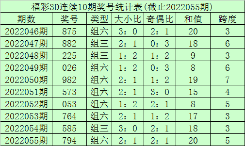 开奖回顾:福彩3D第2022055期奖号开出794。奖号形态开出组六,和值开出20,跨度开出5,奇偶比开出2:1,012路比开出1:2:0,大小比开出2:1。