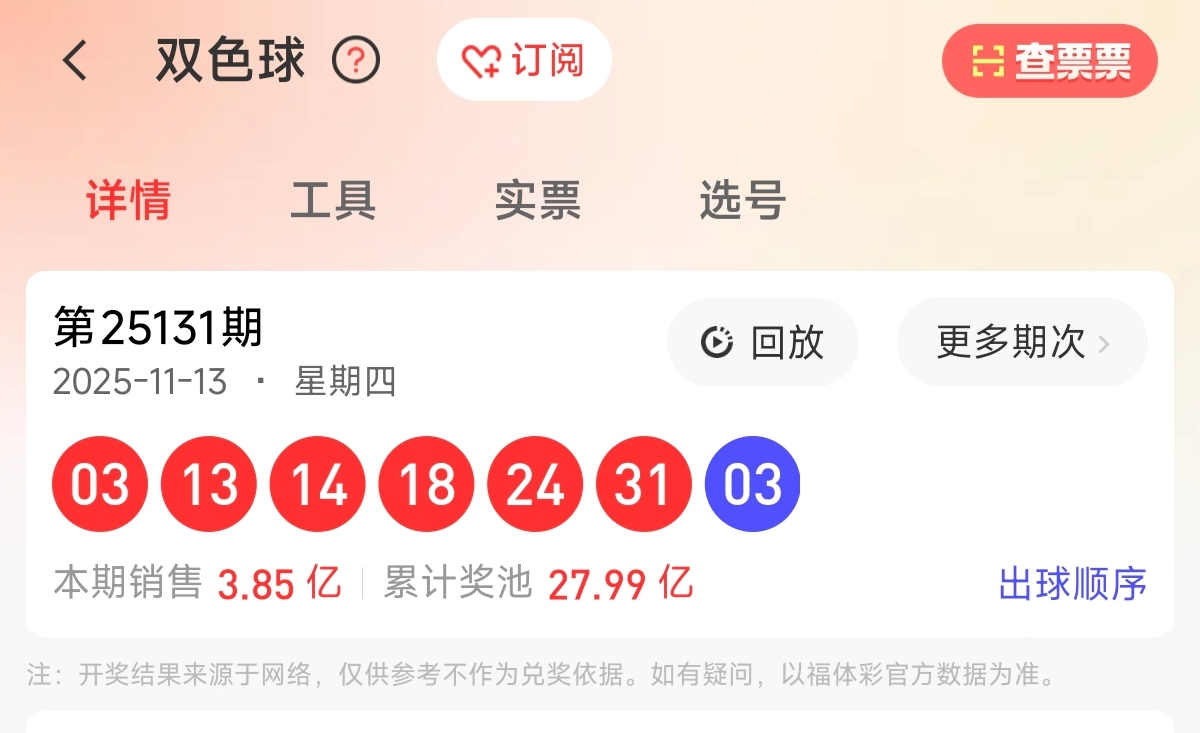 首先让我们回顾一下上期双色球25131期的开奖号码为03、13、14、18、24、31,蓝球03。和值103,跨度28,区间比为1:3:2,奇偶比为3:3。