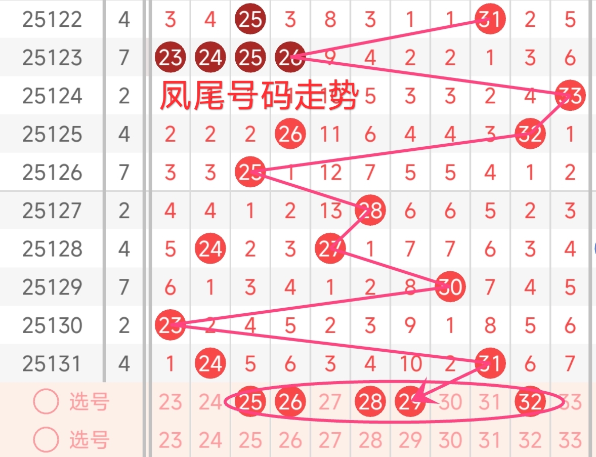 红球三区推荐(23~33): 上期开出2枚号码,号码为24、31,本期红三区建议出号1-2枚,本期红三区建议出关注号25、26、28、29、32。