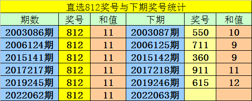 第2022062期3D奖号为:812,历史上该号码直选开出6次,下期号码分别为:550、711、360、911、615。