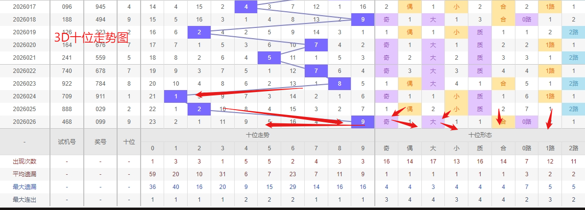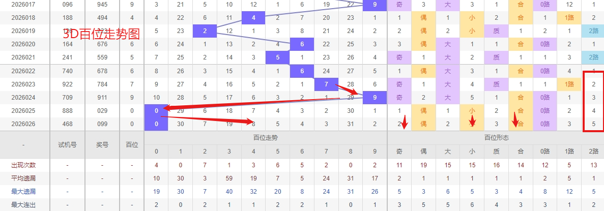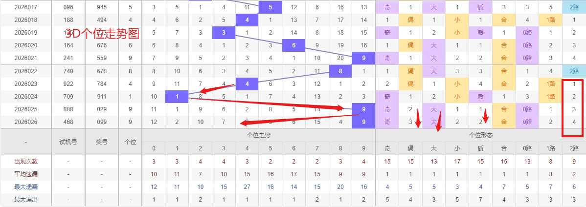 福彩3D个位分析:第2026026期个位开出号码9属于大奇数后端,从以上个位走势图中可以看出近100期的大小比约为53:47奇偶比约为51:49大小奇偶数据上有点差异有需求但不是太明显,不太好看这时就要借助连线走势和遗漏数据来帮助我们缩水号码。上期个位落号“9”大奇数0路号码球,号码开出了0振幅,连续多期的大振必被小振幅取代幅符合我们的预期,那么本期我们在个位考虑振幅走势走前依然要转变思路考虑大振幅,具体考虑(2-6)个振幅是我们主要的方向,那么在对个位落号情况进行系统的分析时我们可以明显的看到个位号码走势呈现大范围震荡,尤其是在号码的落位特点上表现的尤为突出,那么本期我们在个位分析时就要注意号码的风险,避免出现踏空。近期3D个位走势来看,数字“4”作为明确的热号,其高频率出现已经形成了显著的短期趋势,这种热度往往具备一定的持续性,在走势未出现明确拐点前,需要对其继续保持警惕,做好防范。与此同时,数字“3”和“8”处于“温号”状态——它们并非长期遗漏的冷态,出现频率适中且近期有一定活跃度。这种温号状态往往是一个关键信号,它意味着这两个数字正处于蓄势待发的“临界点”,极有可能从温和状态转向热出,具备明确的“转热迹象”。因此福彩3D第2026027期个位看好02468。本文由彩虹多多钱是生命动力所著,请勿转载