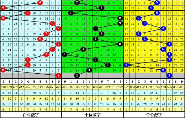 出现次数最少的三个号码分别为:0、3、5,本期预计这三个号码不会同时出现,排除号码:3。