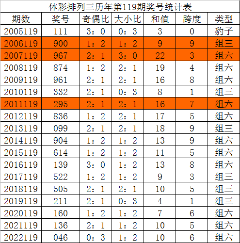 在历年排列三第120期开奖中:组三号码出现7次,组六号码出现10次。组三、组六号码出现比例持平,本期奖号形态关注:组六号码。