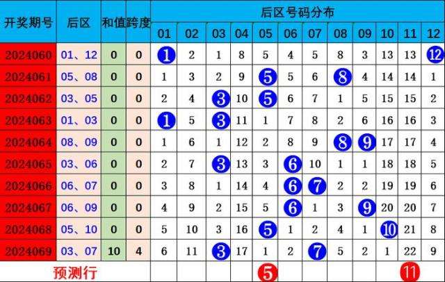 上期开出后区号码:03 07,热热组合。冷热分析:近十期,冷热比5:15,冷号出号较少,综合分析,本期预测热冷组合后区回补,关注号码:05 06 07 11 12。精准推荐:05 11。