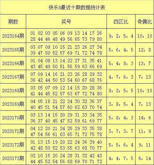 快乐8第2023173期开出奖号:02 10 15 20 24 28 31 32 42 43 44 45 52 54 56 68 69 70 71 72,其中奖号和值为848,跨度为70,012路比为7:6:7,四区比为4:4:7:5,奇偶比为6:14。