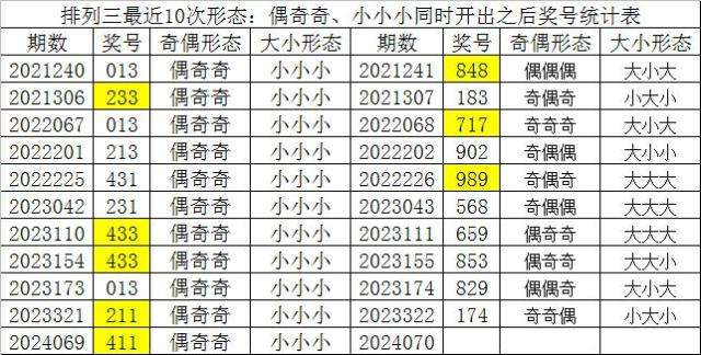 排列三最近10次同时开出奇偶形态:偶奇奇和大小形态:小小小时其奖号分别为:013-233-013-213-431-231-433-433-013-211-411,下期分别开出号码为:848-183-717-902-989-568-659-853-829-174,详细统计见下表: