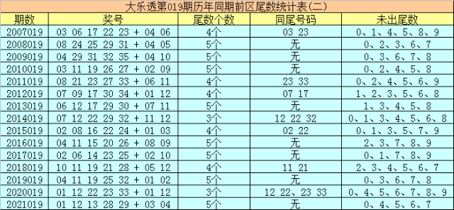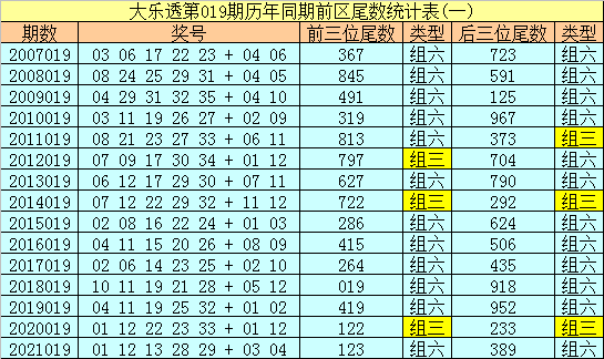在大乐透第019期历年同期奖号中,前区后三位尾数出号频次分别为:尾数2、3、9出现7个,尾数5、7出现5个,尾数0、1、4、6出现3个,尾数8出现2个。其中尾数数字三类型豹子、组三、组六次数比为0:3:12,今年同期后三位尾数类型参考组六;