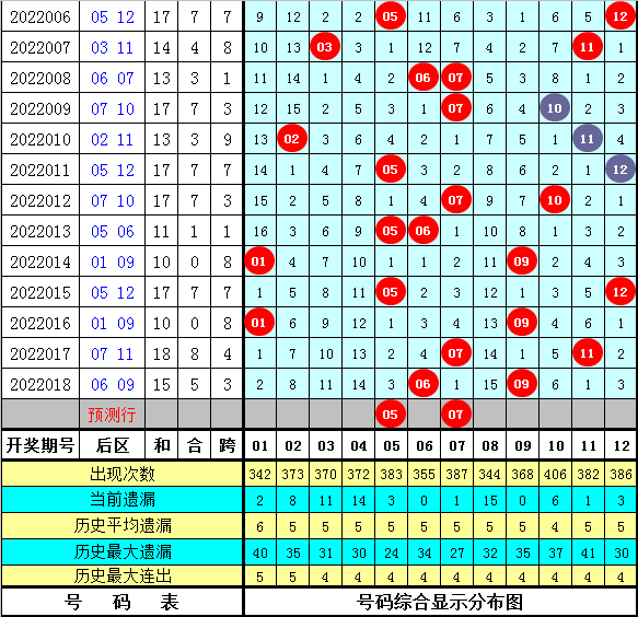 大乐透历年同期第019期后区尾数奇偶比为14:16,最近5年尾数奇偶比为4:6,后区尾数大小比为8:22,最近5年尾数大小比为1:9,本期后区注意号码03、05、06、07、12,后区两码关注05、07。