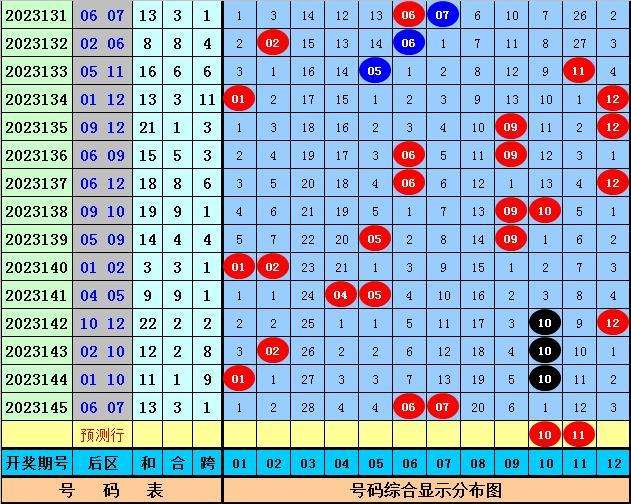 后区分析:上期该位开出奖号06和07,和值为13,跨度为1,后区前4次开出和值13和跨度1时,其下期奖号分别为:01+06、05+12、09+11、02+06,号码奇偶比为4:4,大小比为3:5,012路比为4:1:3,本期后区号码参考01、04、09、10、11,精选两码10、11。