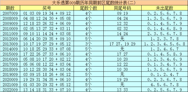 大乐透历年同期第009期后区尾数奇偶比为13:19,最近5年尾数奇偶比为3:7,后区尾数大小比为15:17,最近5年尾数大小比为4:6,本期后区注意号码01、03、06、09、12,后区两码关注01、12。