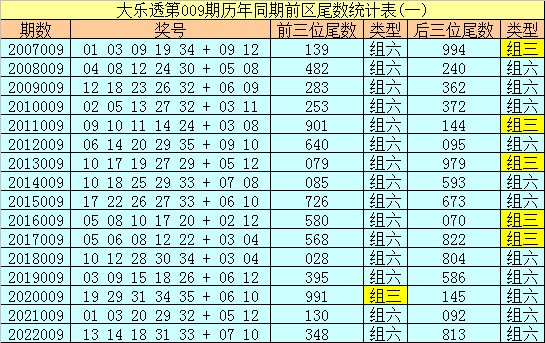 在大乐透第009期历年同期奖号中,前区后三位尾数出号频次分别为:尾数9出现7个,尾数0、2、4出现6个,尾数3出现5个,尾数5、7、8出现4个,尾数1、6出现3个。其中尾数数字三类型豹子、组三、组六次数比为0:5:11,今年同期后三位尾数类型参考组六;