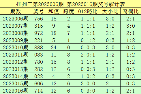 开奖回顾:排列三第2023016期奖号开出:714,组选类型:组六,大小比为1:2,奇偶比为2:1,和值为12,跨度为6。