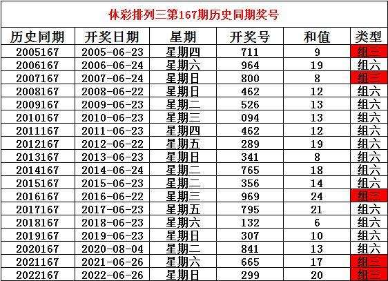 2023年6月26日排列三第167期开奖,历史同期分别开出奖号: