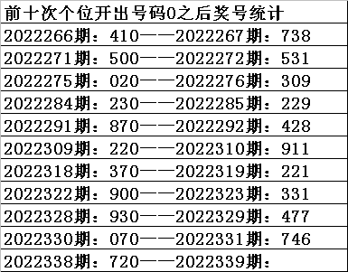 四、个位分析:上期开出号码0,前10次号码0出现之后下期同位号码为:8199811176,其中号码大小比为6:4,基本相当;奇偶比为7:3,奇数号码走势较热;012路比为3:5:2,0路号码走温。本期参考号码:3。