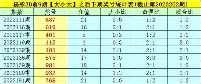 5、在下期奖号中,号码大小比为:3:0、2:1、0:3、0:3、2:1、3:0、2:1、1:2、3:0,号码大小比总比例为16:11,本期预计大号活跃,关注大小比2:1。