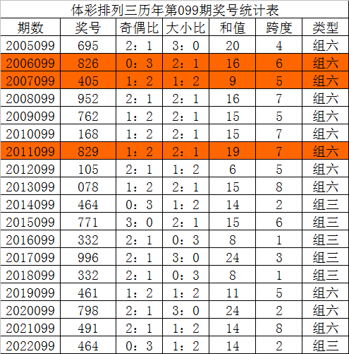 在历年排列三第100期开奖中:组三号码出现4次,组六号码出现13次。组六号码出现比例略高,本期奖号形态参考:组六号码。