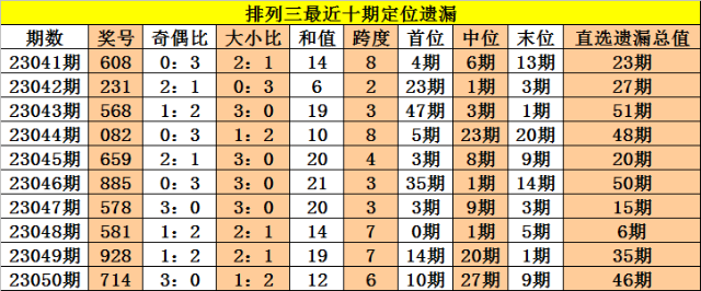 开奖回顾:排列三第2023050期奖号:714,定位直选遗漏值10期、27期、9期,遗漏总值为46期。