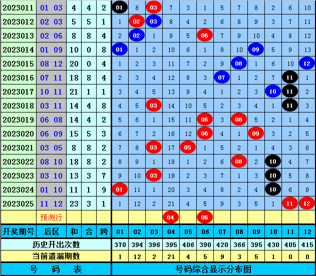后区分析:上期后区两码开出11+12,为全大组合,近50期后区全大组合出现13次,全小组合出现14次,一大一小组合出现23次,,近10期后区全大组合出现4次,全小组合出现1次,一大一小组合出现5次,本期预计后区为全小组合,推荐两码04、06。