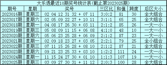 大乐透第2023025期奖号为,前区:03、09、27、30、31;后区:11、12。其中前区奖号三区比为2:0:3,和值为100,跨度为28,后区开出全大组合。