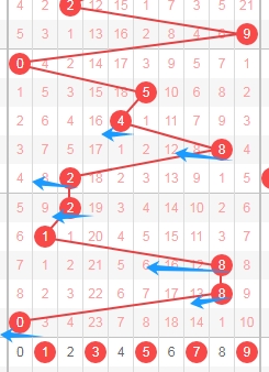 从数字的奇数和偶数分析,上图是排列五开奖号码分布走势图中的第二位走势图,我在上面标注出来的数字都是偶数,看上面走势图中标注出来的蓝色小箭头就知道,最近开出的奇数多,开出的偶数少,那么本期这位数字个人觉得应该关注出偶数02468。