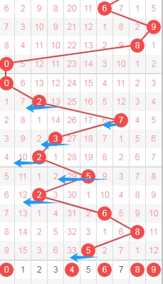 从数字的201路球来分析,上图是排列五开奖号码分布走势图中的第五位走势图,从201路球分析,我在上面标注出来的数字都是0路球数字,最近0路球数字0369已经连续12期没出现,那么本期这个数字可以关注出0路球数字0369。