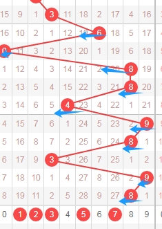 从数字的质数和合数来分析,上图是排列五开奖号码分布走势图中的第三位走势图,我在上面标注出来的数字都是合数04689,从合数和质数来分析,看上面标注出来的蓝色小箭头最近开出的质数多,开出的合数少,那么本期个人观点这位数字可以关注出合数04689。