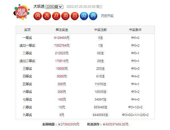大乐透第22082期开奖。当期开奖号码为:前区04 26 27 30 33,后区02 09。当期前区号码大小比为4:1,奇偶比为2:3,三区比1:0:4,前区开出一组连号26 27;后区开出小大组合02 09。