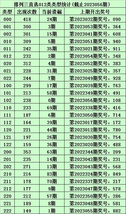 上期回顾:体彩排列三第2023056期开出奖号:108,其012路比为1:1:1,奖号012路类型为:102。