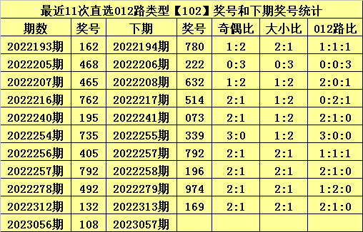 前10次直选102组合出现之后,其下期奖号分别为:780、222、632、514、073、339、792、196、974、169,其中奖号奇偶总比例为17:13,012路总比例为14:9:7,大小总比例为14:16。