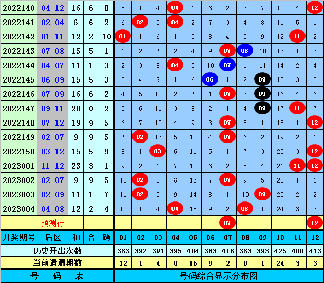 后区分析:上期后区开出1路+2路号、全合组合,最近10期后区奖号012路比为9:5:6,质合比为10:10,本期看好后区在03、04、07、09、12之内落号,精选后区奖号07、12。