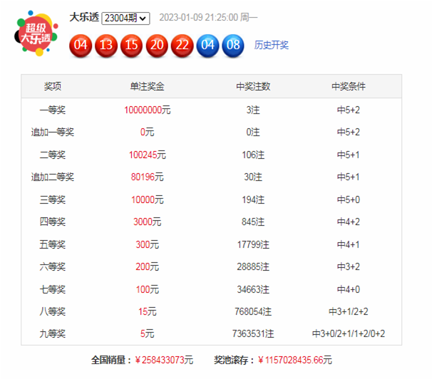 大乐透第2023004期奖号开出:前区04、13、15、20、22,后区04、08。前区号码五区比为1:1:2:1:0,质合比为1:4,012路比为1:3:1,后区开出1路+2路号、全合组合。