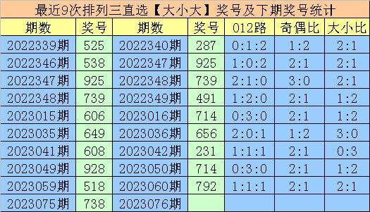 上期回顾:排列三第2023075期奖号为738,组六,大小比开出2:1,直选分布为:大小大。