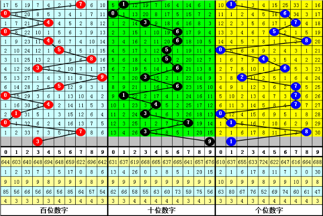 3。在以上9期奖号中,号码012路比分别开出0:1:2、1:0:2、2:1:0、1:2:0、0:3:0、2:0:1、1:1:1、0:3:0、1:1:1,012路出现个数比为8:12:7,本期预计开出012路比2:1:0。