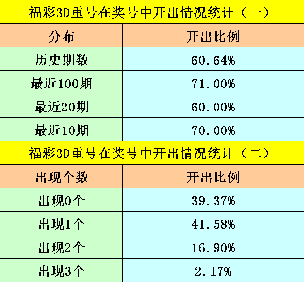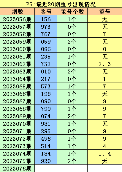 最近100期开奖中,含有重号的奖号有71期,最近20期含有重号的奖号有12期,最近10期含有重号的奖号有7期。本期注意重号落号。