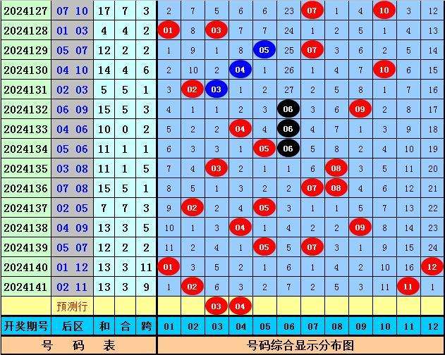 后区分析:在第142期历史同期开奖中,后区奖号全偶出现7次,一奇一偶出现6次,全奇出现2次,今年第142期后区预计出现一奇一偶组合,看好两码03和04。