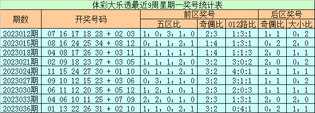 上期回顾:体彩大乐透上周星期一(第2023036期)奖号为01 13 22 26 31 + 02 10,前区奖号五区比为1:1:0:2:1,奇偶比为3:2,012路比为0:4:1,后区奖号奇偶比为0:2,大小比为1:1。