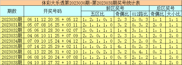 体彩大乐透第2023038期奖号为04 10 18 27 32 + 10 12,前区号码五区比为1:1:1:1:1,奇偶比为1:4,012路比为2:2:1,后区号码奇偶比为0:2,大小比为2:0。