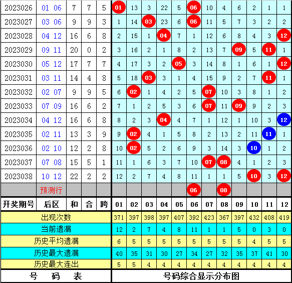 石浩第2023039期大乐透后区分析:后区上周星期一后区奖号为02和10,上期开出奖号10和12,最近9周星期一与最近9期后区奖号奇偶比分别为10:8和8:10,大小比分别为8:10和12:6,本期看好后区出现全偶组合,关注号码02、06、08、12。