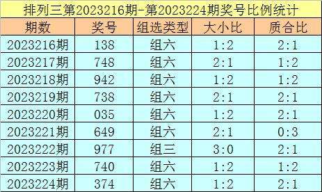 上期回顾:排列三第2023224奖号开出374,奖号质合比为2:1,大小比为1:2,跨度为4,类型为组六。