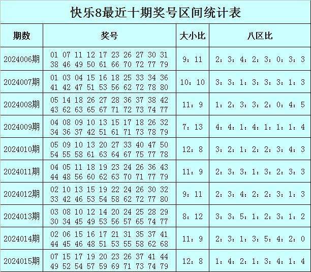 福彩快乐8第2024015期奖号为:07 15 17 19 20 23 26 37 41 44 49 52 54 57 59 69 71 73 74 79,其中奖号大小比为12:8,八区比为1:4:2:1:3:4:1:4。