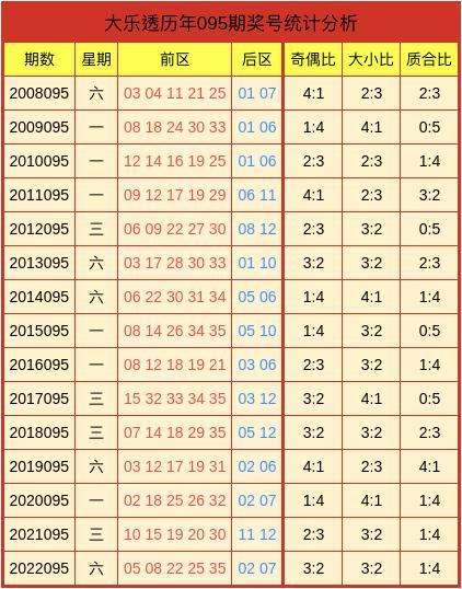 后区分析:在第095期历史同期开奖中,后区最小开出01,最大开出11,奇数号码出现10次,偶数号码出现5次;大数号码出现2次,小数出现13次;质数号码出现13次,合数号码出现2次;