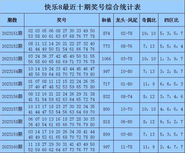 福彩快乐8第2023160期开奖回顾:11 18 27 29 30 31 41 43 49 50 52 59 60 62 64 67 73 76 77 78,其中奖号和值为997,跨度为67,奇偶比开出11:9,012路比开出5:8:7,四区比开出2:4:7:7。