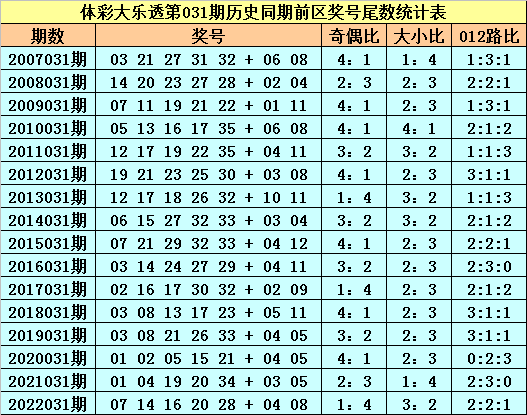 前区尾数频次统计:在第031期历史同期开奖中,前区尾数3、7开出次数最多,为12次,尾数2出现11次,尾数1出现10次,尾数5出现7次,尾数4、6、9出现6次,尾数0、8出现5次,本期前区奖号必杀一尾:9。